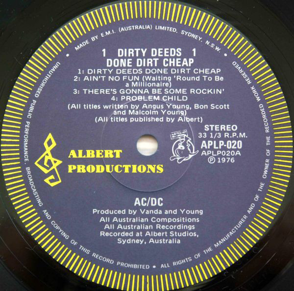 Blue center labels with a kangaroo. Early copies also issued with an advertising insert for optaining a "AC/DC Souvenir Song Book" for $3.00 Recorded at Albert Studios, Sydney, Australia. Back cover: Manufactured and distributed by EMI (Australia) Ltd. Center labels: Made by E.M.I. (Australia) Limited, Sydney, N.S.W. All titles published by Albert