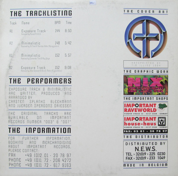 The original tracks are available on Important Records number "003" and "007". A1: 144 BPM, A2: 148 BPM; B1: 152 BPM; B2: 152 BPM Made in Belgium.