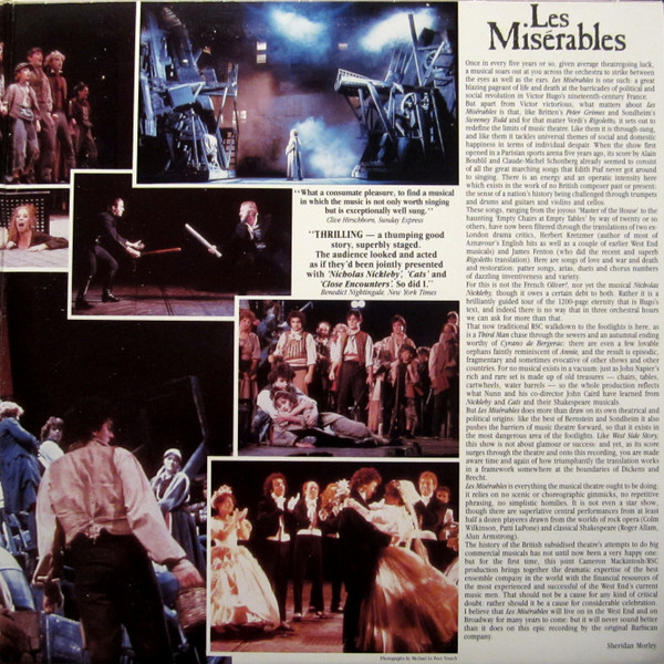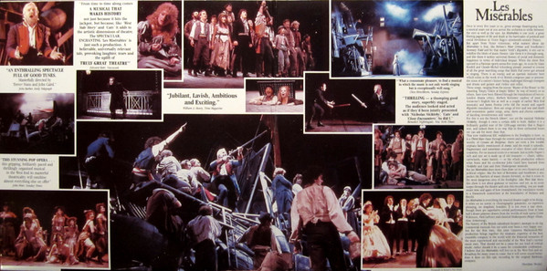 Recorded and mixed at CTS Studios, Wembley, between October 28th and November 12th 1985 Direct Metal Mastered at Sonopress, West Germany ℗ © 1985 Exallshow Ltd. Under License from First Night Records. Gatefold cover w/Inner lyric sleeves. Fantine's Death consists of Come To Me & Confrontation. Love Montage consists of I Saw Him Once, In My Life, and A Heart Full Of Love. most - if not all - pressings on translucent vinyl. vinyl appears opaque, but when held to a light source is revealed to be translucent.