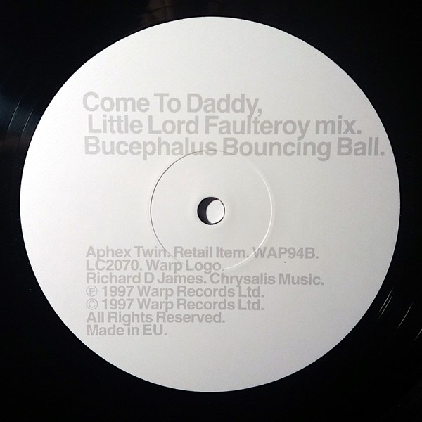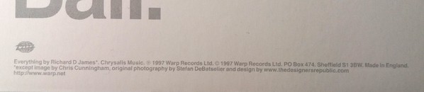 ℗ 1997 Warp Records Ltd. © 1997 Warp Records Ltd. Made in England. On sleeve and B side label, names of the tracks B1 and B2 are counter-changed. Picture sleeve which has "Made in England" printed on the back while both center labels have "Made in E.U." printed instead.