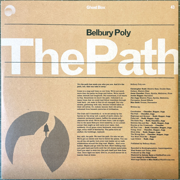 Issued with a printed reverse-board inner sleeve. Includes a download voucher for all 17 tracks from the [url=https://www.discogs.com/release/27968238-Belbury-Poly-The-Path]CD version[/url], including 4 non-LP instrumental tracks. All runout details are laser etched. [Rear jacket:] (P) Ghost Box 2023 (C) Ghost Box 2023 [Inner sleeve:] Recorded in Buckinghamshire, Cambridgeshire, West Sussex and Texas, 2022