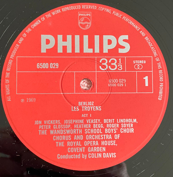Box-set containing 5 LP's, a 44 page illustrated booklet with an introduction, an additional 36 page booklet with the libretto and a three-language (English, French & German) info sheet about the various awards this first-ever recording of "Les Troyens" has received Note that the records state (P) 1969 on the Labels, but most of the Runouts state (P) 1970.