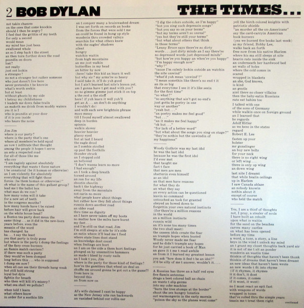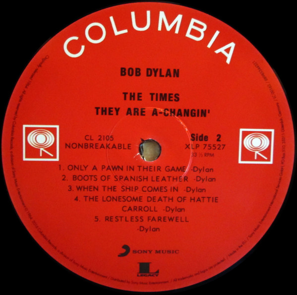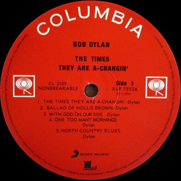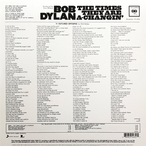 Front cover sticker says: LEGACY VINYL 180 Gram Superior Audio Quality legacyrecordings.com Front cover: 'MONO-CL 2105' in upper left corner, 'GUARANTEED HIGH FIDELITY' in lower right corner. Includes a paper sheet of Bob Dylan prose.