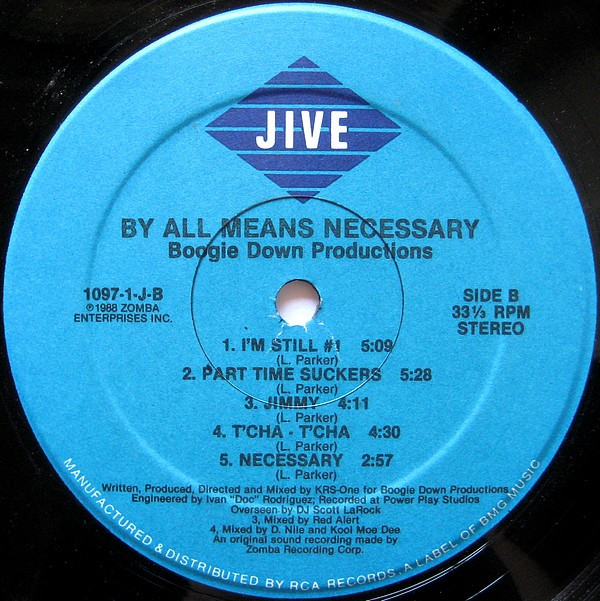 Written, produced, directed and mixed for Boogie Down Productions. This version is the Hauppauge pressing and can be identified by the arrangement of the text on the labels and by the 'ᐉ' runout groove stamp. There is also a [url=https://www.discogs.com/release/5333385]Specialty Records pressing variation[/url].