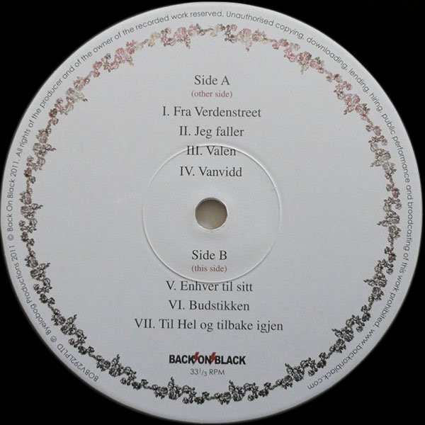 Pressed on 180 gram vinyl housed in a gatefold sleeve, available in three colours: -black vinyl (this) -clear vinyl -flesh-toned vinyl Track 1 in inner sleeve: Fra Verdenstreet (Introduksjon) Track 7 in inner sleeve: Til Hel Og Tilbake Igjen (Konklusjon)