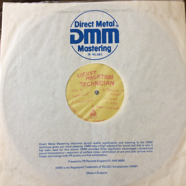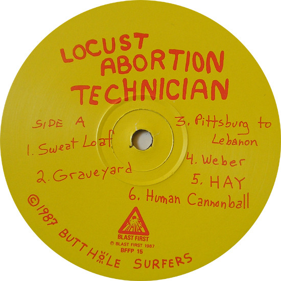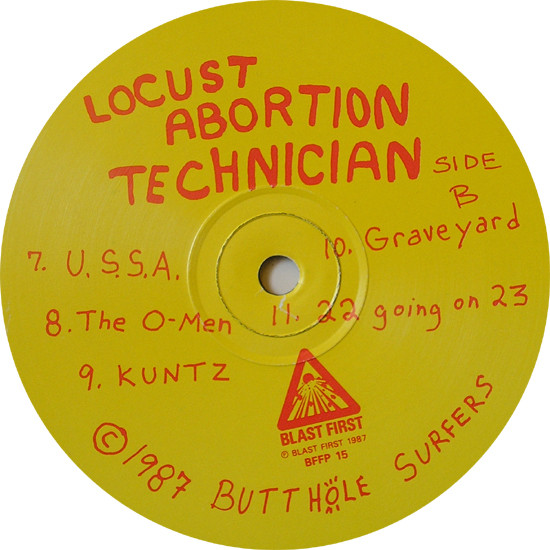 This version has red writing on yellow labels, unlike the other version of [r=1735271] which has black writing on yellow labels. The release have sequentially listed tracks on the labels (1 to 11) Front cover painting © 1980 Aurthur Sarnoff. ℗ Blast First 1987 © 1987 Butthole Surfers Direct Metal Mastering.