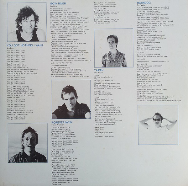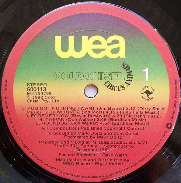 Outer sleeve: Marketed by WEA Record & Tape Distributors Pty. Limited. [Warner logo] A Warner Communications Company Inner sleeve: Recorded and mixed at Paradise Studios and EMI Studio 301, Sydney September to December 1981 Labels: ℗ 1982 Cold Chisel Pty. Ltd. Recorded and Mixed at Paradise Studios and EMI Studio 301, Sydney - September to December 1981 Manufactured and Distributed by WEA Records Pty. Limited WEA Records Pty. Limited [Warner logo] a Warner Communications Company Runout groove: Side A matrix has been etched as 'MX 199 799 600 113-21 PI' with the '2' crossed out Misprint: ‘Bow River’ and ‘No Good For You’ swapped positions on back cover.