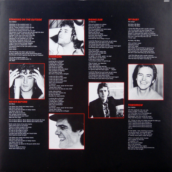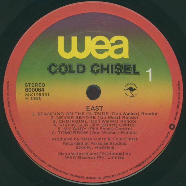 7" single included with first 10,000 of the 1st press albums only. 7" reads: "Not For Sale. Issued as Limited Edition Disc with "EAST" ALBUM 600064" "Knockin' On Heaven's Door" Recorded Live At The Bondi Lifesaver, Sydney, Australia. Some copies came with hype sticker adhered to front stating - " Contains limited edition bonus single, Knockin' On Heaven's Door (recorded live) Buy 12 tracks - get 2 free! 600064 Printed inner sleeve with lyrics. Recorded and mixed at Paradise Studios, Sydney–March and April, 1980 This album is dedicated to the memory of Alan Dallow and Billy Rowe. Manufactured and Distributed by WEA Records Pty. Limited Publishers: A1 to A3, A6, B1, B3 to B6, D: Rondor A4, A5, B2: Control C: Chappell