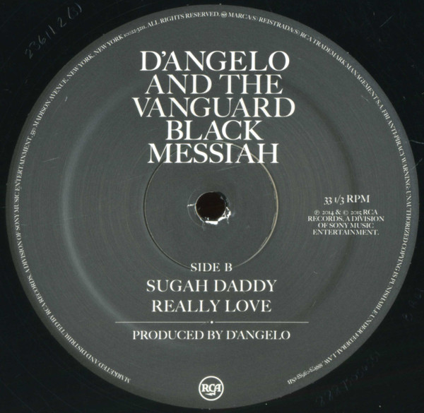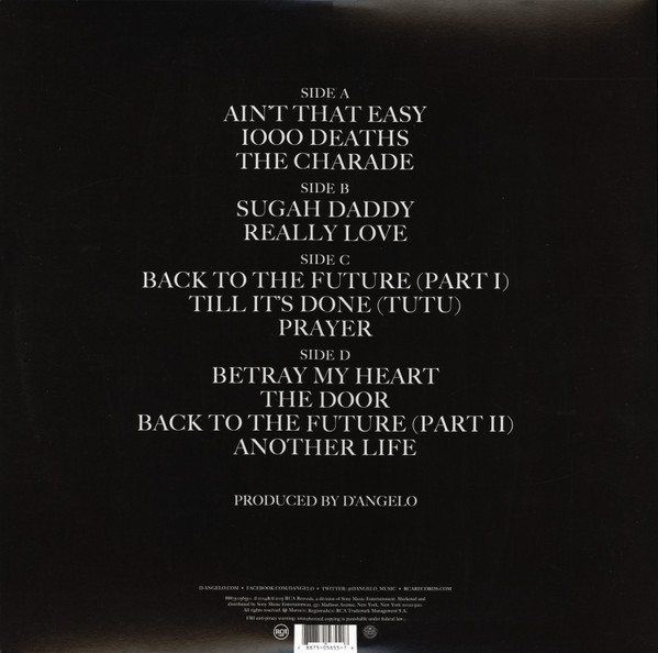 Gatefold sleeve. Includes eight-page booklet with a download code. ℗ 2014 & © 2015 RCA Records, a division of Sony Music Entertainment. Marketed and distributed by Sony Music Entertainment, 550 Madison Avenue, New York, New York 10022-3211. A1: Published by Ah Choo Music Publishing (ASCAP)/12:00 AM Music (ASCAP) (administered by Universal Polygram International Publishing), U Betta Like My Muzic/Songs Of SMP (ASCAP), Ear Kandy Music (BMI) A2: Published by Ah Choo Music Publishing (ASCAP)/12:00 AM Music (ASCAP) (administered by Universal Polygram International Publishing), Ear Kandy Music (BMI) Contains a portion of the audio from the film "The Murder of Fred Hampton" used courtesy of Chicago Film Archives. A3 and D4: Published by Ah Choo Music Publishing (ASCAP)/12:00 AM Music (ASCAP) (administered by Universal Polygram International Publishing), Legendelphia Music LLC/Universal Music-Careers (ASCAP), Ear Kandy Music (BMI) B1: Published by Ah Choo Music Publishing (ASCAP)/12:00 AM Music (ASCAP) (administered by Universal Polygram International Publishing), U Betta Like My Muzic/Songs Of SMP (ASCAP), Ear Kandy Music (BMI), Onip Songs/BMG Bumblebee (BMI), Gadtoon Music (BMI) B2: Published by Ah Choo Music Publishing (ASCAP)/12:00 AM Music (ASCAP) (administered by Universal Polygram International Publishing), Ear Kandy Music (BMI), Warner-Tamerlane Publishing Corp. (BMI) Contains a sample from "We The People Who Are Darker Than Blue" written and performed by Curtis Mayfield, published by Warner-Tamerland Publishing Corp. (BMI), under license from Warner Bros. Records, Inc. by arrangement with Rhino Entertainment Company, a Warner Music Group company. C1, C3, D1 and D3: Published by Ah Choo Music Publishing (ASCAP)/12:00 AM Music (ASCAP) (administered by Universal Polygram International Publishing) C2: Published by Ah Choo Music Publishing (ASCAP)/12:00 AM Music (ASCAP) (administered by Universal Polygram International Publishing), Ear Kandy Music (BMI), Onip Songs/BMG Bumblebee (BMI), Legendelphia Music LLC/Universal Music-Careers (ASCAP) D2: Published by Ah Choo Music Publishing (ASCAP)/12:00 AM Music (ASCAP) (administered by Universal Polygram International Publishing), Ear Kandy Music (BMI) Recorded at M.S.R. Studios, Hydra SF, Henson Studios, The Plant, Sear Sound, Avatar Studios and Quad Studios. Mixed at M.S.R. Studios and Henson Studios. "No digital "plug-ins" of any kind were used in this recording. All of the recording, processing, effects and mixing was done in the analog domain using tape and mstly vintage equipment for best results. Listen at maximum volume." Management: Kevin Liles, KWL Enterprises, Inc. and Alan Leeds, Shelltoe Entertainment Business Management: Joshua Klein and Keri Weaver, Monarch Business and Wealth Management, LLC Legal Representation: Paul Rothenberg, Samantha Shipp and Lesa Kasambalides, Rothenberg P.C. "Thanks to Peter Edge, Tom Corson, Jocelyn Cooper, Matthew Morgan, Michelle Ryang, Irene Sourlis, Carolyn Williams, Erwin Gorostiza, Theola Borden, Junko Takada, Annie Meaher, Beth Hawkins, Nat Pastor, Roe Williams, Ashish Chutei, Heathcliff Berru, Scott Mantell, Questlove, Q-Tip, Bill Reeves, Lou Barber, Roxane George, Mark Jenkins, Tina Farris, Cecilia Ramirez, The Vanguard (Past and Present), Little Homey, Dominique Trenier." Questlove appears courtesy of Def Jam Records. Roy Hargrove appears courtesy of Groove and High Records. Runouts are etched, except "MASTERDISK" is stamped.