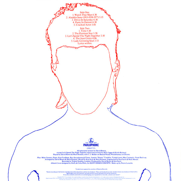 The LP is issued in a white poly-lined inner sleeve and housed in a gatefold jacket. The package includes replicas of the original printed inner sleeve and fan club form. Catalog number as 0825646289431 (DB69735) on spine. Catalog number as (DB69735) on back cover. Catalog number as DBXL1 (DB 69735) (0825646289431) on labels. Track list on labels: A1: Watch That Man (New York) A2: Aladdin Sane (1913-1938-197?) (R.H.M.S. "Ellinis") A3: Drive-In Saturday (Seattle – Phoenix) A4: Panic In Detroit (Detroit) A5: Cracked Actor (Los Angeles) B1: Time (New Orleans) B2: The Prettiest Star (Gloucester Road) B3: Let's Spend The Night Together B4: The Jean Genie (Detroit and New York) B5: Lady Grinning Soul (London) A1 to B1, B5 © 1973 B2 © 1970 B4 © 1972 Runouts are hand-etched. In runouts, all Optimal plating symbols (e.g., "IΛ5" and "IΛट") are mirrored. On side A of variant 4, it is also upside down. [Sticker on front cover:] Remastered heavyweight 180g vinyl [Rear sleeve:] Recorded at Trident Studios, London. Album cover designed [...] for [a2823062]. *Linda Lewis appears by courtesy of [l157]. Originally ℗1973 The copyright in this sound recording is owned by Jones/Tintoretto Entertainment Co., LLC under exclusive license to Parlophone Records Ltd. Digital remaster ℗2013 The copyright in this sound recording is owned by Jones/Tintoretto Entertainment Co., LLC under exclusive license to Parlophone Records Ltd. ©2015 Jones/Tintoretto Entertainment Co., LLC. This label copy information is the subject of copyright protection. All rights reserved. ©2015 Parlophone Records Ltd. A Warner Music Group Company. [Inner sleeve:] All songs published by North America - Tintoretto Music (BMI) administered by RZO Music, Inc., Screen Gems-EMI Music, Inc. (BMI) o/b/o EMI Music Publishing Ltd., Chrysalis Songs (BMI). Rest of World - Tintoretto Music/RZO Music Ltd., EMI Music Publishing Ltd., Chrysalis Music Ltd. except 'Let's Spend The Night Together' published by North America - Gideon Music Inc., ABKCO Music Inc. (BMI). Rest of World - Westminster Music Ltd., ABCKO Music Ltd. and 'The Prettiest Star' published by North America - Carlin Music Ltd. Rest of World - Carlin Music Corp. [Fan club form:] This is a replica of the original issued in 1973 and is no longer valid. [Labels:] ℗ 1973 ℗ 1973 The copyright in this sound recording is owned by Jones/Tintoretto Entertainment Co., LLC under exclusive license to Parlophone Records Ltd. Digital remaster ℗ 2013 The copyright in this sound recording is owned by Jones/Tintoretto Entertainment Co., LLC under exclusive license to Parlophone Records Ltd. © 2015 Jones/Tintoretto Entertainment Co., LLC. [...] © 2015 Parlophone Records Ltd. A Warner Music Group Company. [...] Made in the EU.