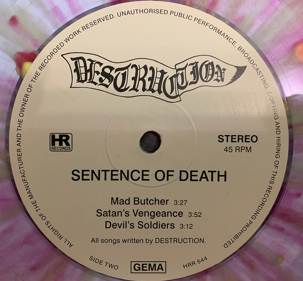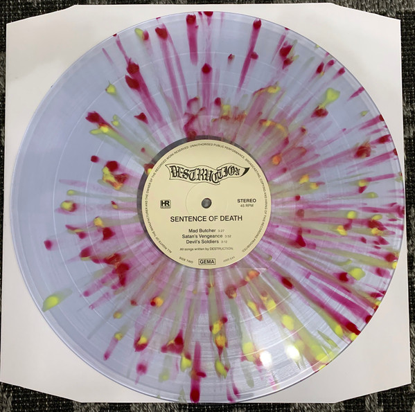 3rd pressing: ltd 500, 200 x sea-blue/ black marbled + 300 x "fire" splatter vinyl (clear vinyl with magenta red and yellow splatter) [THIS] "Euro cover" Includes 425gsm heavy cardboard cover, insert, printed inner sleeve, A5 photo and poster.