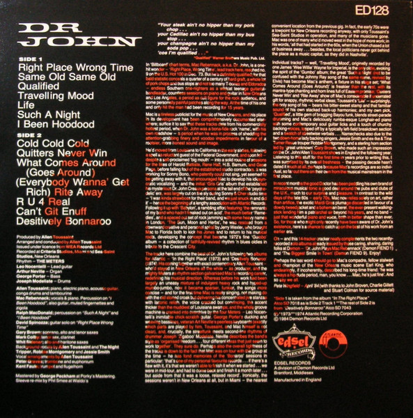 A compilation of tracks from [r=554882] ATCO SD 7018 (1973) and [r=519115] ATCO SD 7043 (1974). Issued under licence from WEA Records Ltd. ℗ 1973-1974 Atlantic Recording Corporation © 1984 Demon Records Ltd. Recorded at Criteria Studios, Miami and Sea-Saint Studios, New Orleans.