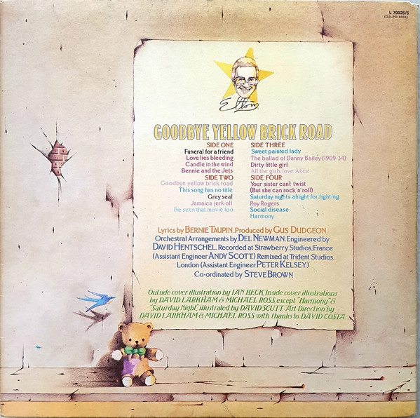 Different Australian vinyl versions: [url=https://www.discogs.com/Elton-John-Goodbye-Yellow-Brick-Road/release/5425578]Yellow vinyl[/url] [url=https://www.discogs.com/Elton-John-Goodbye-Yellow-Brick-Road/release/5427543]Blue vinyl[/url] [url=https://www.discogs.com/Elton-John-Goodbye-Yellow-Brick-Road/release/5427581]Red vinyl[/url] [url=https://www.discogs.com/release/1048715]Different label font[/url] from this version, with no cassette catalog no. on the top right corner of the rear sleeve. [url=https://www.discogs.com/Elton-John-Goodbye-Yellow-Brick-Road/release/10214462]Different label font[/url] from this version, with "Cassette C 70025/6" on the top right corner of the rear sleeve. Gatefold sleeve. In the side A runout matrix no., in the first "2C", there is actually an etched over "A" between the 2 and the C; Made in Australia by Festival Records Pty Ltd. © 1973 This Record Co. Limited ℗ 1973 This Record Co. Limited