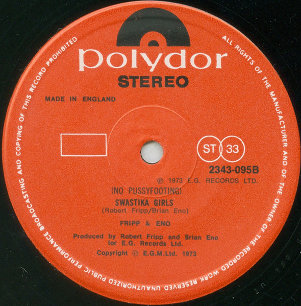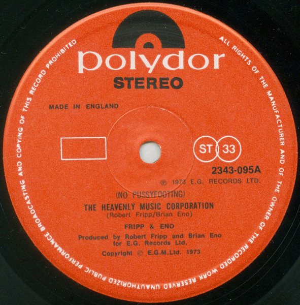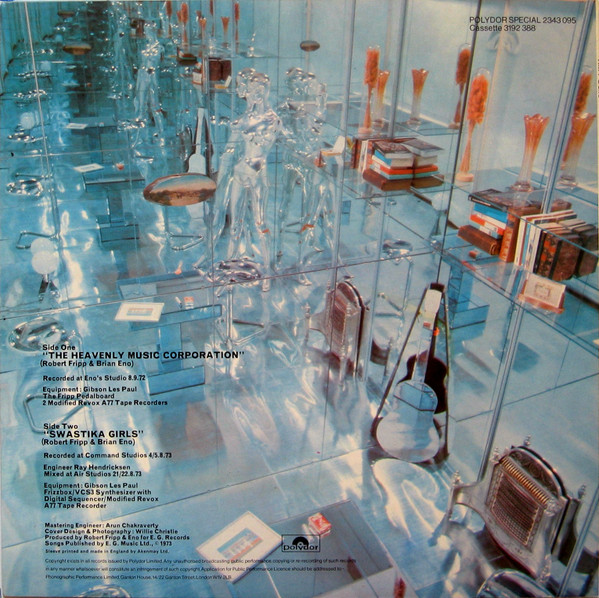 Produced for E. G. Records Songs published by E. G. Music Ltd., © 1973 Sleeve printed and made in England by Akenmay Ltd. Made in England. ℗ 1973 E.G. Records Ltd. Copyright © E.G.M.Ltd. 1973 POLYDOR SPECIAL 2343 095 Cassette 3192 388 "The Heavenly Music Corporation" Recorded at Eno's Studio 8.9.72 Equipment: Gibson Les Paul, The Fripp Pedalboard 2 Modified Revox A77 Tape Recorders. "Swastika Girls" Recorded at Command Studios 4/5.8.73 Mixed at Air Studios 21/22.8.73 Equipment: Gibson Les Paul Frizzbox / VCS3 Synthesizer with Digital Sequencer / Modified Revox A77 Tape Recorder. Same version with different printer: [r476649]