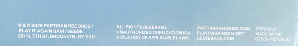 ℗ & © 2025 Partisan Records / Play It Again Sam / Geese 281 N. 7th St. Brooklyn, NY 11211 PartisanRecords.com PlayItAgainSam.net GeeseBand.com Made in the Czech Republic Matrix numbers are machine etched, with the exception of the codes beginning 0238, which are laser etched. The barcode and the catalogue number PTPS60LPX appear only on a sticker on the outer shrinkwrap of sealed copies. Everywhere else, PTPS60LP is used.