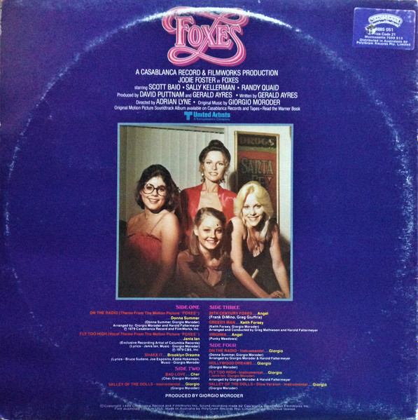 [Title front sleeve;] (Casablanca Record and FilmWorks Presents) Music From The Motion Picture Foxes [rear sleeve;] Foxes (A Casablanca Records & FilmWorks Production) [spine;] Music From The Motion Picture Soundtrack "Foxes" [labels] Music From The Motion Picture "Foxes" [Front sleeve] Copyright © 1980 United Artists Corporation. [Rear sleeve] Distributed in Australasia by PolyGram Records Pty. Limited [A1] Theme From The Motion Picture "Foxes" [;] ℗ 1979 Casablanca Record and FilmWorks, Inc. [A2] Vocal Theme From The Motion Picture "Foxes" [;] Janis Ian Excusive Recording Artist of Columbia Records [;] ℗ 1979 CBS, Inc. ℗ Copyright 1980 Casablanca Record and FilmWorks Inc. Sound recording made by Casablanca Record and FilmWorks Inc. First published 1980 in USA. Made in Australia by PolyGram Records Pty. Limited under exclusive licence. [Inner gatefold] Recorded at Rusk Sound Studios, Burbank Studios, Westlake Audio, Allen Zentz Recording and the Record Plant, New York City. Mastered at Allen Zentz Larry Williams and Jerry Hey appear courtesy of Horizon Records Stephanie Spruill appears courtesy of Arista Records [Labels] [A2] Exclusive Recording Artist of Columbia Records - Janis Ian [A1, D1] Intersong/C.C. [A2, D3] Festival [A3, B1 to C3, D2, D4] Intersong ℗ Copyright [Side A; side D] 1979/1980 [Side B; side C] 1980 Casablanca Record & FilmWorks Inc. - Sound recording made by Casablanca Record & FilmWorks Inc. - first publ. [Side A; side D] 1979/1980 [Side B; side C] 1980 in U.S.A. Made in Australia by PolyGram Records Pty. Ltd. under exclusive licence Sides auto-coupled; A = record 1 side 1, B = record 2 side 2, C = record 2 side 3, D = record 1 side 4.