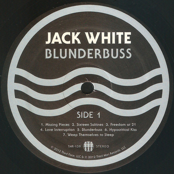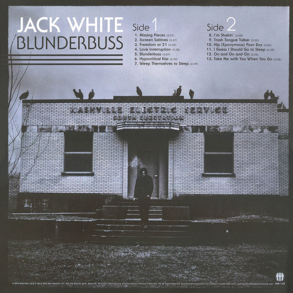 © 2012 Third Face, LLC & ℗ 2012 Third Man Records, LLC All songs written by Jack White (Third String Tunes - BMI) except "I'm Shakin'" written by Rudolph Toombs (Unichappell Music - BMI) Gatefold sleeve Black inner sleeve and a four-page 12"x12" black and blue lyrics insert Some copies have the barcode sticker on the shrink wrap, some haven't. All runouts are etched.