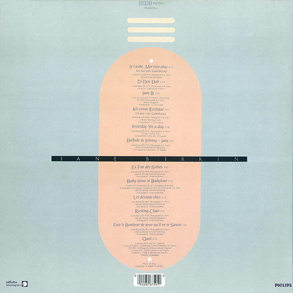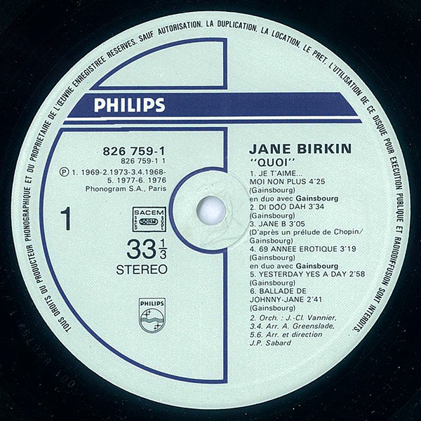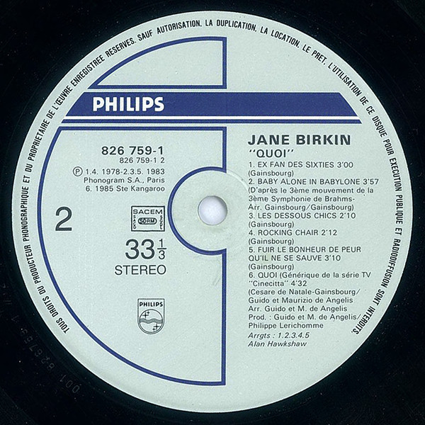 Publication Phonogram PG 278 826 759 1 [url=https://www.discogs.com/Jane-Birkin-Quoi/release/4210377]MC 826 759 4[/url] A1: ℗ 1969 Phonogram S.A. Paris A2: ℗ 1973 Phonogram S.A. Paris A3: ℗ 1968 Phonogram S.A. Paris A4: ℗ 1968 Phonogram S.A. Paris A5: ℗ 1977 Phonogram S.A. Paris A6: ℗ 1976 Phonogram S.A. Paris B1: ℗ 1978 Phonogram S.A. Paris B2: ℗ 1983 Phonogram S.A. Paris B3: ℗ 1983 Phonogram S.A. Paris B4: ℗ 1978 Phonogram S.A. Paris B5: ℗ 1983 Phonogram S.A. Paris B6: ℗ 1985 Phonogram S.A. Paris