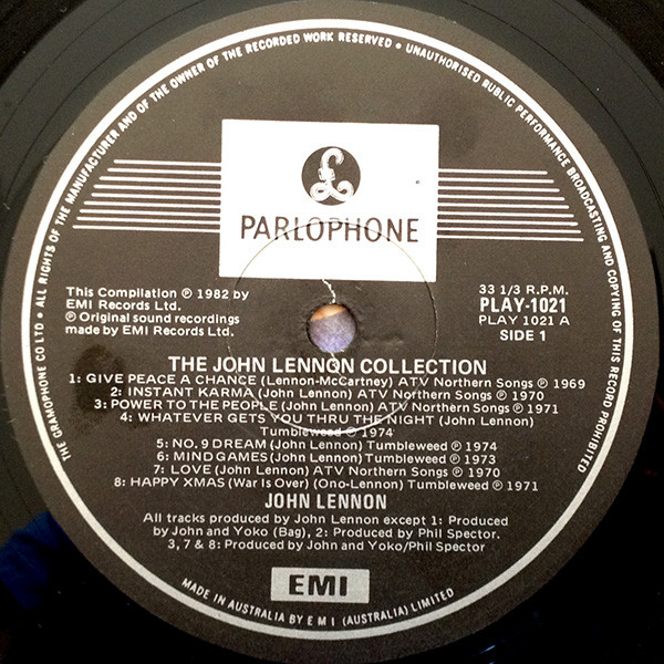 Labels rim text shows The Gramophone Co Ltd. A1 recorded in Room 1742, Montreal, Canada. Mastered at Artisan Sound Recorders, Hollywood. Cat# PLAY.1021 is used on the spine, back cover and inner sleeve. PLAY-1021 is used on the labels. Back cover has a large Lenono Music logo and a small EMI Records Australia logo. Labels are Parlophone. This compilation ℗ 1982 by EMI Records Ltd.