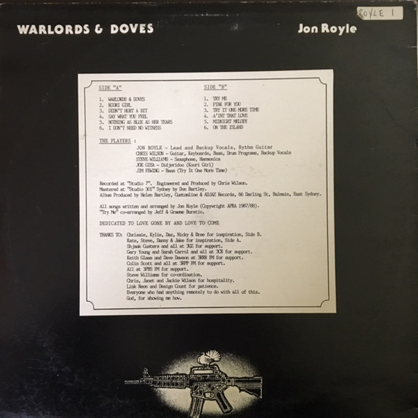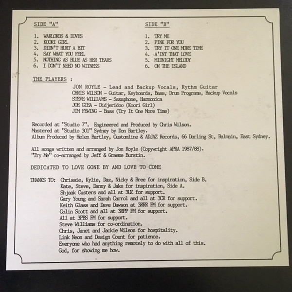 All songs written and arranged by Jon Royle (Copyright APRA 1987/88)., "Try Me" co-arranged by Jeff & Graeme Burstin Dedicated to love gone by and love to come.