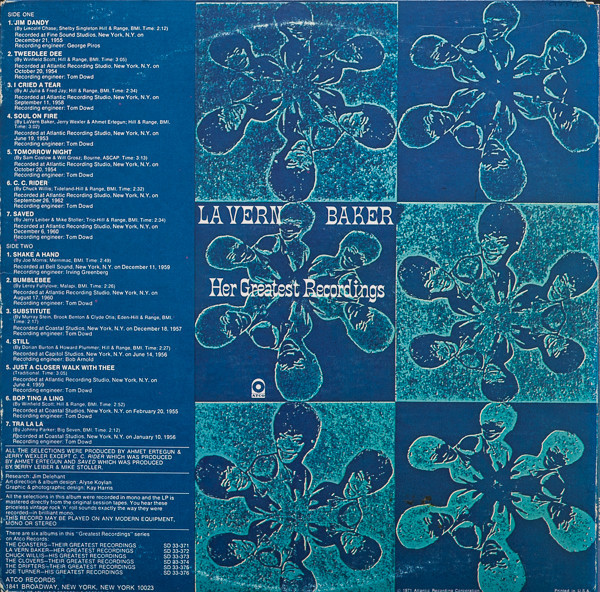 "RI" plant code in label matrices and "PR" etched in runouts denote [l=Philips Recording Company, Inc.], pressing. Remainder of runouts etched. Label variation, with track A6 as "C.C. Rider," and two tracks above center spindle hole. Issued in a UNIPAK fold-out cover in the "Greatest Recordings" series. Back liner: "All the selections in this album were recorded in mono and the LP is mastered directly from the original session tapes. You hear these priceless vintage rock 'n' roll sounds exactly the way they were recorded‒in brilliant mono." Track recording details from back cover: A1: Recorded at Fine Sound Studios, New York, N.Y. on December 21, 1955. A2, A5: Recorded at Atlantic Recording Studio, New York, N.Y. on October 20, 1954. A3: Recorded at Atlantic Recording Studio, New York, N.Y. on September 11, 1958. A4: Recorded at Atlantic Recording Studio, New York, N.Y. on June 12, 1953. A6: Recorded at Atlantic Recording Studio, New York, N.Y. on September 26, 1961. A7: Recorded at Atlantic Recording Studio, New York, N.Y. on December 6, 1960. B1: Recorded at Bell Sound, New York, N.Y. on December 11, 1959. B2: Recorded at Atlantic Recording Studio, New York, N.Y. on August 17, 1960. B3: Recorded at Coastal Studios, New York, N.Y. on December 18, 1957. B4: Recorded at Capitol Studios, New York, N.Y. on June 14, 1956. B5: Recorded at Atlantic Recording Studio, New York, N.Y. on June 4, 1959. B6: Recorded at Coastal Studios, New York, N.Y. on February 20, 1955. B7: Recorded at Coastal Studios, New York, N.Y. on January 10, 1956. Track publishers: A1: Shelby Singleton-Hill & Range, BMI. A2 to A4, B4, B6: Hill & Range, BMI. A5: Bourne, ASCAP. A6: Tideland-Hill & Range, BMI. A7: Trio-Hill & Range, BMI. B1: Merrimac, BMI. B2: Malapi, BMI. B3: Eden-Hill & Range, BMI. B7: Big Seven, BMI. Mfg. by Atlantic Recording Corporation, 1841 Broadway, New York, N.Y. © 1971 Atlantic Recording Corporation