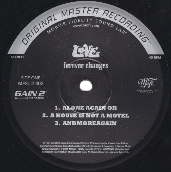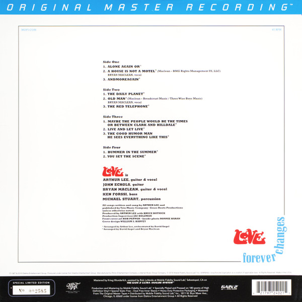℗ 1967 & 2016 Elektra Entertainment Group Production and Mastering by Mobile Fidelity Sound Lab Specially Plated and Pressed on 180 grams of High Definition Vinyl Special Static Free - Dust Free Inner Sleeve Heavy Duty Protective Packaging Mastered From The Original Master Tapes 1/4" / 15 IPS analog master to DSD 256 Misprint On Backcover: Bryan Maclean´s Songwriting And Vocal-Credits For A1 "Alone Again Or" Were Mistakenly Attributed To A2 "A House Is Not A Motel", Which Was Written And Sung By Arthur Lee.