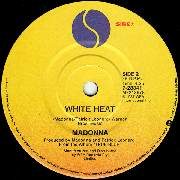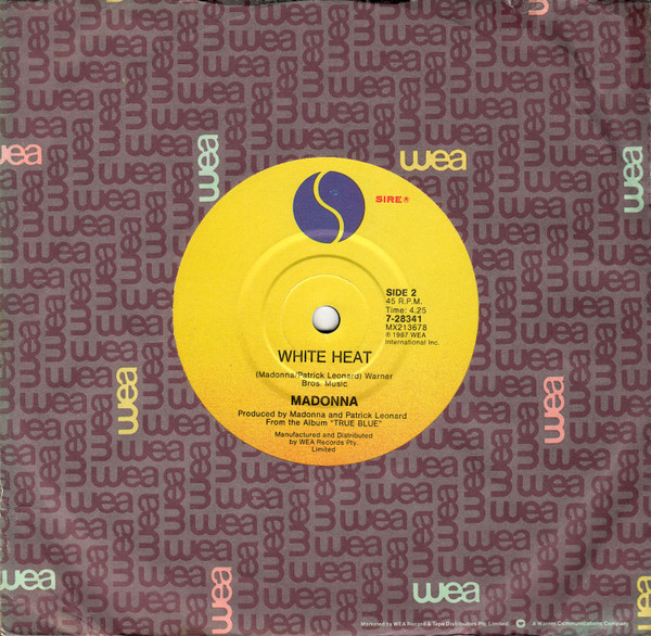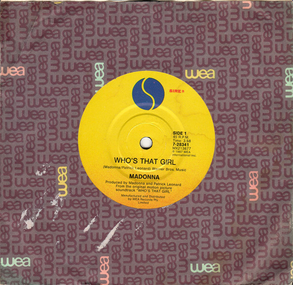 Issued in generic WEA records paper sleeve. Back sleeve: Marketed by WEA Records & Tape Distributors Pty. Limited. A Warner Communications Company Label side A/B: ℗ 1987 WEA International Inc. Manufactured and Distributed by WEA Records Pty. Limited. Label side A: From the original motion picture soundtrack "[url=https://www.discogs.com/Madonna-Whos-That-Girl-Original-Motion-Picture-Soundtrack/release/5169396]WHO'S THAT GIRL[/url]" Label side B: From the album "[url=https://www.discogs.com/Madonna-True-Blue/release/3495048]TRUE BLUE[/url]"