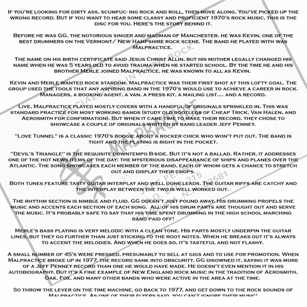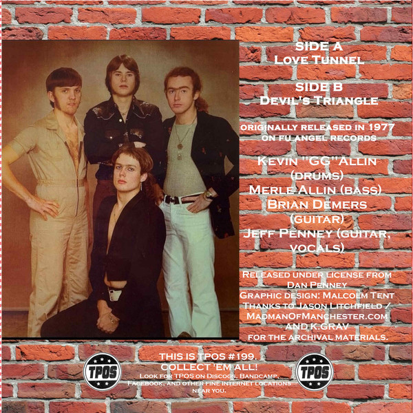 Notable for the fact that this is the first vinyl appearance of Kevin Allin AKA GG Allin, on drums and Merle Allin on bass. First pressing of 1060 copies. Random mixed color was used by the pressing plant and the colors break down as follows: -450 copies on "rock royalty" purple vinyl -600 copies on "satiny bellbottom" plum vinyl Since the pressing plant used random mixed vinyl, the shades of each color vary. Pictured in this listing are representative photos of each color.