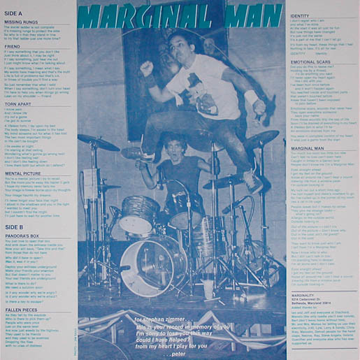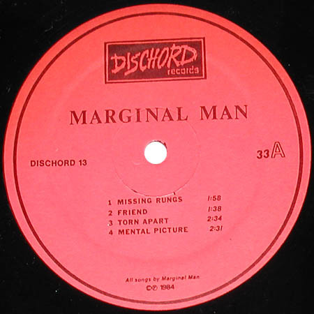 Recorded at Inner Ear Studios 11/83. Top right corner of back cover specifies the record's price as $4.00; second pressing lists the price as $5.00. Red labels. Single-sided insert includes lyrics, photo, band contact information. Marginal Man logo and lyrics printed in greenish blue. Runouts are etched except for MASTERDISK stamp.