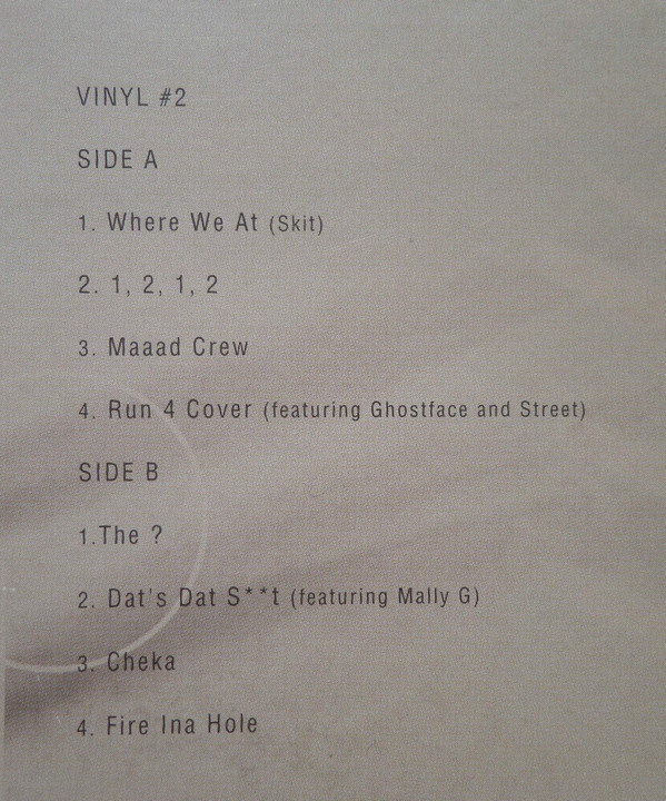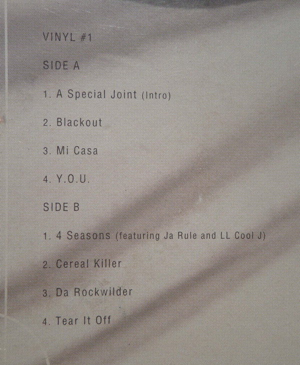 Original US Pressing. Track sequencing on both inner sleeves is incorrect. "Inner Sleeve Two" lists the credits for three tracks that aren't on the vinyl version of "Blackout!": "Well All Rite Cha," "Big Dogs" and "How High (Remix)." Inner sleeve one: Please see LP jacket for track sequence "A Special Joint" (Intro) [...] Music produced by [...] 4 Funky Noble Productions [...] Recorded and Mixed at Mirror Image Times Square, NYC by [...] "A Special Joint" contains a sample from "Spanish Moon" [...] Naked Snake Music (ASCAP), performed by [...]. Under license from Warner Brothers Records. By arrangement with Warner Special Products. "Tear It Off" [...] Produced by [...] for Funklord Productions. Recorded and Mixed at Mirror Image Times Square, NYC by [...] "Tear It Off" contains samples from "Funkin' Lesson" [...] Bridgeport Music, Inc. (BMI)/Vanglorious Music/Universal Music Group, Performed by [...] . Courtesy of Universal Music Special Markets and "Give Up The Funk (Tear The Roof Off The Sucker)" [...] Bridgeport Music, Inc./Rubberband Music, Inc. (BMI). Performed by [...]. Courtesy of Universal Special Markets. Used By Permission. "Mi Casa" [...] Produced by [...] for Funklord Productions. Recorded and Mixed at Mirror Image Times Square, NYC by [...] Mixed at Mirror Image Times Square, NYC by [...] "Maaad Crew" [...]Produced By [...] for Funklord Productions. Recorded at Mirror Image Times Square, NYC by [...] Mixed at Mirror Image Times Square, NYC by [...] "Maaad Crew" contains a sample from "Sandworms" [...] Publishing One's Music, LLC (ASCAP) administered by MRBI, performed by [...]. Used courtesy of CTI. "The ?" [...] Produced by [...] 4 Funky Noble Productions. Recorded at Mirror Image Times Square, NYC by [...] Mixed at Mirror Image Times Square, NYC by [...] Missy Elliott appears courtesy of Elektra Entertainment Group "The ?" contains a sample from "Can I Get A..." [...] Lil LuLu Music/DJ Irv Music/Ja Music (BMI), performed by [...]. Used courtesy of Def Jam Records. [...] Used By Permission. "Cheka" [...] Produced by [...] for Brick Mob Productions. Co-produced by [...] 4 Funky Noble Productions. Recorded at Enterprise Recording Studios, LA, CA by Brian Springer. Mixed at Mirror Image Times Square, NYC by [...] "Check" contains an interpolation of "Mic Cheka" [...] EMI April Music (ASCAP)/ EMI Blackwood/Trio Music/Fort Knox Music (BMI)/Sony/ATV Music; also it contains a sample from "The Payback" [...] Dynatone Publishing Company/Unichappell Music, Inc. (BMI), performed by [...]. Courtesy of Universal Music Group. "1, 2, 1, 2" [...] Produced by [...] for B.U.D.A. Productions. Recorded and Mixed at Soundtrack Studios, NYC by [...] Inner sleeve two: "Da Rockwilder" [...] Produced by [...] for F-% Productionz. Recorded at Electric Lady, NYC by [...] "Run 4 Cover" [...] Recorded at Soundtrack Studios, NYC by [...] Mixed at Mirror Image Times Square, NYC by [...] Ghostface appears courtesy of Razor Sharp/Epic Records Street appears courtesy of Method Man Entertainment "4 Seasons" [...] Produced by [...] for Funklord Productions. Recorded and Mixed at Mirror Image Times Square, NYC by [...] Ja Rule appears courtesy of Murder Inc. Records/Island Def Jam Records LL Cool J appears courtesy of Island Def Jam Records "Dat's Dat S**t" [...] Recorded at Mirror Image Times Square, NYC by Tommy Uzzo & 36 Chambers, NYC by Choco. Mixed at Mirror Image Times Square, NYC by [...] "Blackout" [...] Produced by [...] for Funklord Productions. Recorded and Mixed at Mirror Image Times Square, NYC by [...] "Blackout" contains an interpolation of "Fat Boys" [...] Windswept Pacific Songs (BMI)/EMI Blackwood Music. "Y.O.U." [...] Produced by [...] for Funklord Productions. Recorded at Mirror Image Times Square, NYC by [...] Mixed at Mirror Image Times Square, NYC by [...] "Y.O.U." contains a sample from "Electric Relaxation" [...] EMI Unart Catalogue, Inc. (BMI)/Zomba Enterprises (ASCAP), performed by [...]. Courtesy of Zomba Recordings Corp. "Cereal Killer" [...] Recorded at 36 Chambers, NYC by [...] Mixed at 36 Chambers , NYC by RZA & Mirror Image Times Square, NYC by Tommy Uzzo [...] "Cereal Killer" contains a sample from "The Rub" [...] Windswept Pacific Songs (BMI), performed by George and Gwen McRae. Used courtesy of Rhino Records. By arrangement with Warner Special Products, Inc. and EMI Records UK. "Fire Ina Hole" [...] Recorded at 36 Chambers, NYC by [...] Mixed at 36 Chambers, NYC by [...] "Where We At" [...] Music produced by [...] 4 Funky Noble Productions [...] Recorded and Mixed at Mirror Image Times Square, NYC by [...] "Well All Rite Cha" (R. Noble, E. Sermon, C. Smith) Produced by Erick Sermon for Funklord Productions. Recorded and Mixed at Enterprise Recording Studios, LA, CA by Bob Brown "Big Dogs" (C. Smith, R. Noble, E. Sermon) Produced by Erick Sermon for Funklord Productions. Co-produced by Redman. Recorded at Encore Studios, Los Angeles, CA by Mauricio Iragorri. Mixed at Mirror Image, Dix Hills, NY by Erick Sermon "Big Dogs" contains a sample from "Tell 'Em" (E. Sermon) Erick Sermon Enterprises, Inc., administered by Zomba Music Publishing (ASCAP). Used courtesy of Def Jam Records. Under license from PolyMedia, a Division of PolyGram Group Distribution, Inc. "How High (Remix)" (R. Noble, E. Sermon, C. Smith, S. Levay, S. Prager) Produced by Erick Sermon for Funklord Productions. Recorded at Rockin' Reel Recordings, Long Island, NY by Dave Greenberg. Mixed at Mirror Image Recordings by Troy Hightower "How High (Remix)" contains an interpolation of the composition "Fly Robin Fly" (S. Levay, S. Prager) Edition Meridian Ralph Fiegel/Edition Butterfly administered in the U.S.A. by Mizmo Music, agent for Sounds of Jupiter, Inc. (BMI)/GEMA. Contains a sample of the Cover Girls "I Am Woman". Used courtesy of Quality Records. On back cover: ℗ © 1999 The Island Def Jam Music Group [...] A Universal Music Company. On labels: ℗ 1999 Island Def Jam Music Group [...] Printed in U.S.A. Run