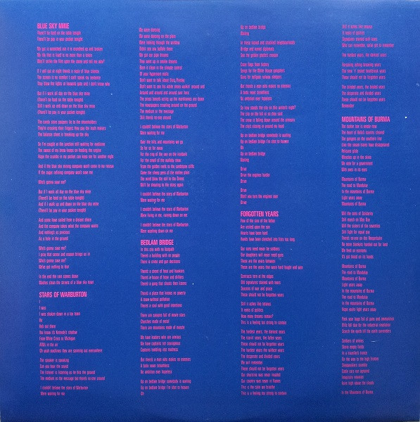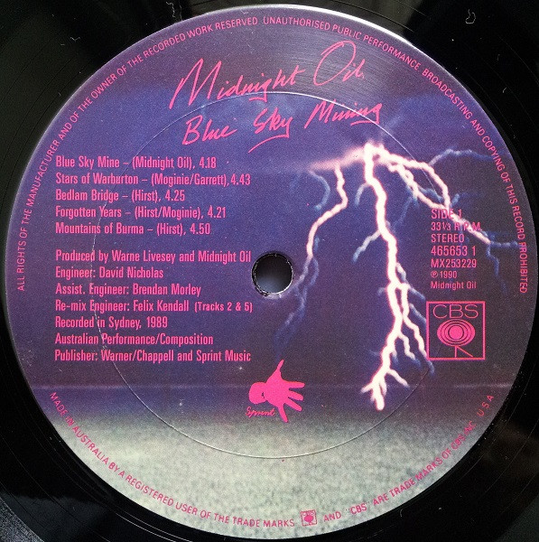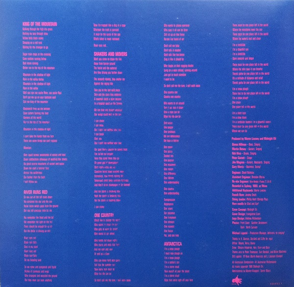 Released in an outer sleeve, and an inner sleeve with lyrics to side A on one side, and lyrics to side B and credits on the other side. In the side A runout matrix no., "MASTERED BY STUDIOS 301" is stamped and upside down relative to the other characters, all other characters are hand-etched. Outer sleeve: [CBS logo] and CBS are trade marks of CBS Inc., U.S.A./© 1990 Midnight Oil./℗ 1990 Midnight Oil/Sound recording made by Midnight Oil - first published ℗ in Australia 1990 Inner sleeve: Recorded in Sydney, 1989, at Rhino Labels: ℗ 1990 Midnight Oil Made in Australia by a registered user of the trade mark [CBS logo] and "CBS" are trade marks of CBS Inc. U.S.A.
