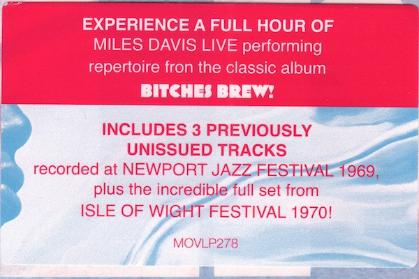 Tracks A1 to A3 recorded live at the Newport Jazz Festival, Newport, RI, July 5, 1969 Tracks B1 to C4 recorded live at the Isle of Wight on August 29, 1970 Mastered at Battery Studios, New York City © 2011 Sony Music Entertainment / Originally recorded 1969 & released 2011 (tracks A1 to A3), originally recorded 1970 & released 2009 (tracks B1 to C4). ℗ Compilation 2011 Sony Music Entertainment / Manufactured & distributed by Music On Vinyl B.V. for Sony Music Entertainment. Includes 12-Page Full Colour Booklet Etched D-Side 180 gram audiophile pressing Crediting mistake on release: In fact "Directions" is written by Joe Zawinul, "Bitches Brew" by Miles Davis.