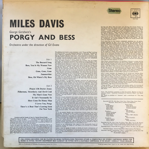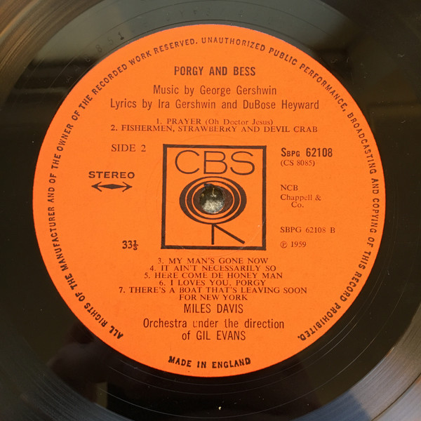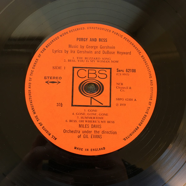 Flipback sleeve. Miles Davis George Gershwin's Porgy And Bess Orchestra under the direction of Gil Evans Recorded 22/7/58, 29/7/58, 4/8/58, 18/8/58 at the Columbia 30th Street Studio in New York City. Labels: Plain orange labels with square CBS logo in centre. Made in England.