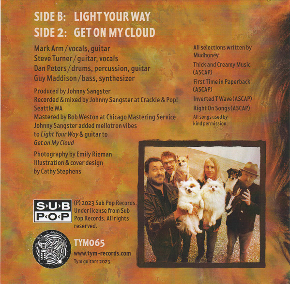 Limited release to coincide with [a83081] April 2023 tour of Australia promoting [m3042449]. From [l489279] website: "These 2 new (previously unreleased) songs were mastered by Bob Weston exclusively for this Tym records release and are available here and on merch stands on the current Australian tour. This new limited edition 7″ is available in 2 different covers because Mark and Steve couldn’t agree on which one was better." Runouts are hand-etched.