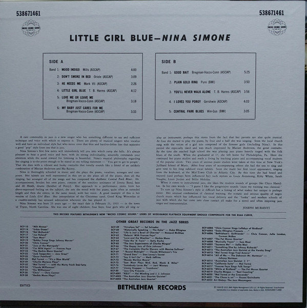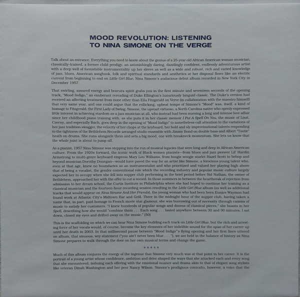 Pressed on heavyweight (transparent) blue vinyl, issued in tip-on jacket with printed and poly inner sleeve. Barnes & Noble Exclusive released on their July '21 "Vinyl Day" weekend in the US and in Europe on December 17th. New essay by the author of "Liner Notes For The Revolution", Daphne A. Brooks is printed on dedicated paper inner sleeve. US hype sticker has misprint of omitted space: "ofLiner". Mastered by Kevin Gray at Cohearent Audio. **Not sure if this is unique to this release or if all releases have had a misprint of a wrong track time. Track B5 Central Park Blues runs closer to 6:47 than to the 3:05 noted on back cover.