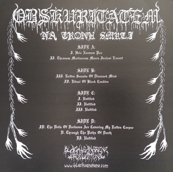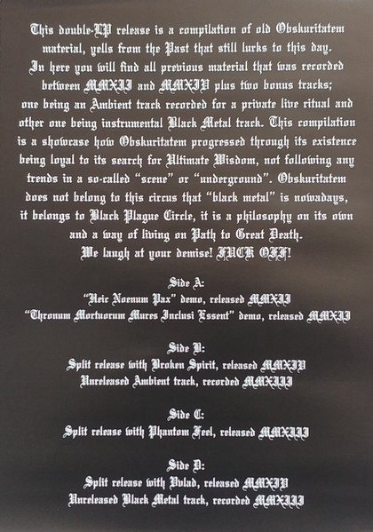 Limited to an undisclosed number of copies. Includes a double-sided insert. Track A1 was originally released as the [r=3867408] cassette. Track A2 was originally released as the [r=4025913] cassette. Track B1 was originally released on the [url=https://www.discogs.com/Broken-Spirit-2-Obskuritatem-Broken-Spirit-Obskuritatem/release/5828887]split cassette[/url] with [url=https://www.discogs.com/artist/3888799-Broken-Spirit-2]Broken Spirit[/url]. Track B2 is previously unreleased. Tracks C1 to C3 were originally released on the [url=https://www.discogs.com/Obskuritatem-Phantom-Feel-Obskuritatem-Phantom-Feel/release/4633188]split cassette[/url] with [a3031274]. Tracks D1 and D2 were originally released on the [url=https://www.discogs.com/Vvlad-Obskuritatem-Vvlad-Obskuritatem/release/6592705]split cassette[/url] with [a3573140]. Track D3 is previously unreleased.
