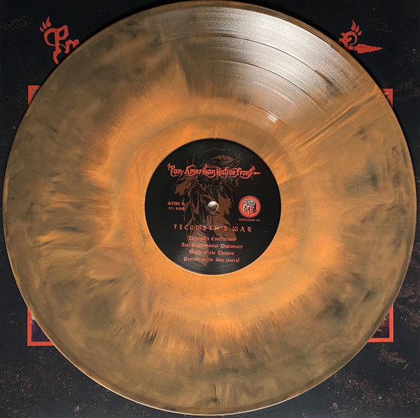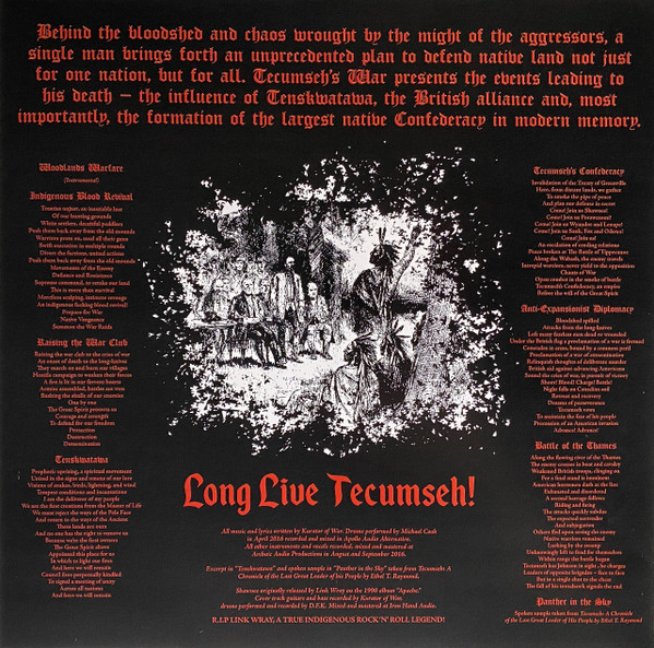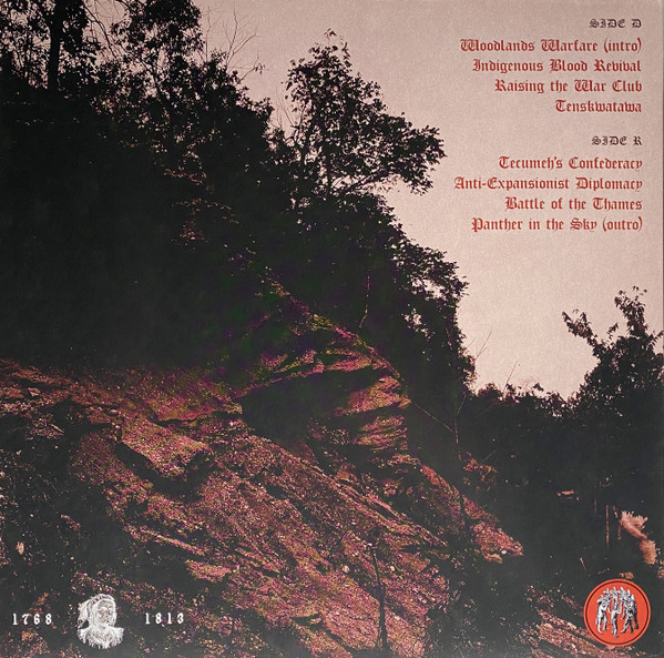 Pressed on brown/black marble vinyl, limitation undisclosed. The first 100 orders from the label were limited to this version as well as some being sold by Iron Bonehead in Europe. Housed in a jacket flooded black inside and includes a double-sided 12x12" lyrics insert. Drums performed on April 2, 2016, recorded and mixed in Apollo Audio Alternative. All other instruments and vocals recorded, mixed and mastered at Archaic Audio Productions in August and September 2016. Tracks re-mastered at Iron Hand Audio in January 2019. Excerpt in "Tenskwatwa" taken from "Tecumseh: A Chronicle of the Last Great Leader of His People" by Ethel T. Raymond. Spoken sample in "Panther in the Sky" taken from "Tecumseh: A Chronicle of the Last Great Leader of His People" by Ethel T. Raymond. Shawnee originally released by [a246644] on the 1990 album [url=https://www.discogs.com/Link-Wray-Apache/release/4016707]Apache[/url]. Cover track guitars and bass recorded by [a8120464], drums performed and recorded by D.F.K. Mixed and mastered at Iron Hand Audio. Tecumseh's Confederacy is misspelled on this release on both the back cover and label.
