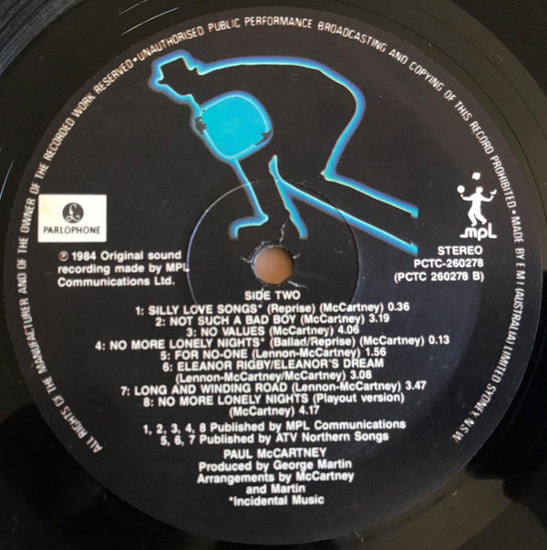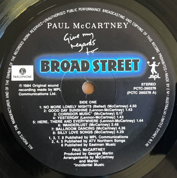 'Original soundtrack music from Paul McCartney's Give My Regards To Broad Street.' Tracks A3, B1 and B4: incidental music. Recorded in England. This album was mixed digitally. Steve Lukather and Jeff Porcado courtesy CBS Records. Louis Johnson courtesy A & M Records. John Paul Jones courtesy EMI Records. Dave Edmunds courtesy Arista Records. L.C.G.C. courtesy Island Records. Tracks A1, A3, A7 to B4, B6b and B8 published by MPL Communications A2, A4, A5, B5, B6a and B7 published by ATV Northern Songs A6 published by Eastman Music First catalogue number appears on back cover and spine, second on labels.