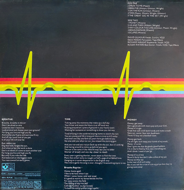 Centre Labels: Label Code: SHVLA-804 Around Top Edge: The Gramophone Company Ltd. All rights of the manufacturer and of the owner of the recorded work reserved. Unauthorised public performance broadcasting and copying of this record prohibited. Around Bottom Edge: Made In Australia by E.M.I. (Australia) Limited. On Cover: Catalog Number: SHVLA.804 Release Date: 1973 Release Information: Original issue. Description: Gatefold cover Front Cover: Black with prism. Laminated. Inserts: 1) A blue pyramid poster. There is no catalog number on the poster. 2) A six-pane group shot poster in landscape style with "SHVL 804" in the bottom right corner. 3) Two separate Pink Floyd self-adhesive stickers, one yellow and one brown. Labels: Black E.M.I. labels with prism. Note on Credits: Though credited for the entire album, Barry St. John, Doris Troy, Lesley Duncan, and Liza Strike perform backing vocals only on tracks A4, B2, B4, and B5.