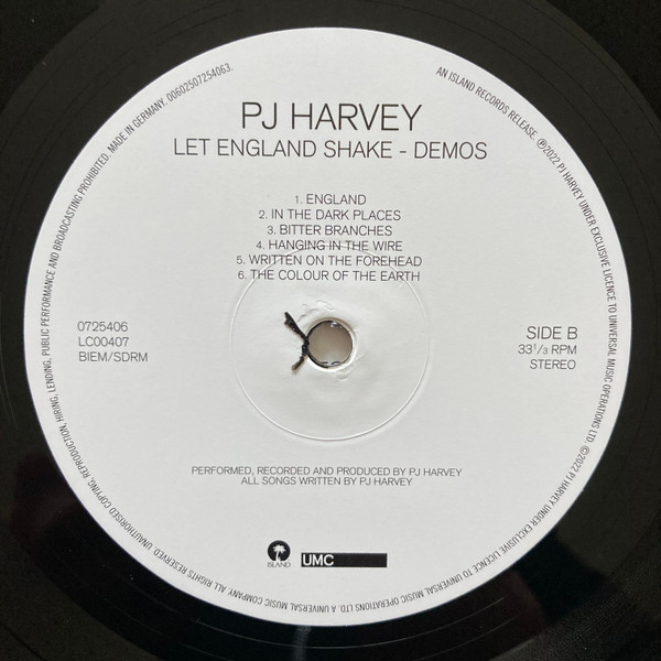 A small number of pre orders from the PJ Harvey website store came with a Limited edition signed lyric sheet. Download card included. Includes a custom inner sleeve and a hype sticker. An Island Records Release. ℗2022 PJ Harvey under exclusive license to Universal Music Operations Ltd. ©2022 PJ Harvey under exclusive license to Universal Music Operations Ltd. A Universal Music Company. Universal International Music B.V. 's-Gravelandseweg 80, 1217 EW Hilversum, Netherlands. Made in Germany. Original demo recordings performed, recorded and produced by PJ Harvey in Dorset, 2008 Published by Hot Head Music Limited (ASCAP) Administered by Kobalt Songs Music Publishing (ASCAP) Track A1 contains a sample of the song 'Istanbul (Not Constantinople)' by the Four Lads, used courtesy of Sony Music Entertainment. 'Istanbul (Not Constantinople)'by Jimmy Kennedy & Nat Simon, used by kind permission of Carlin Music Corp. Track A3 contains elements from 'The Bed's Too Big Without You' by The Police, written by Sting. Published by G M Sumner. All rights reserved & licensed courtesy of Polydor Records Limited. Also includes a sample of 'Regimental March' bugle call performed by HM Irish Guards. Licensed courtesy of LTM Music Publishing Limited. Track A4 contains a sample of the recording 'Summertime Blues' performed by Eddie Cochran. Courtesy of Capitol Records, a division of UMG Recordings, Inc., under license from Universal Music Enterprises. Contains elements from 'Summertime Blues' written jointly by Jerry Capehart and Edward Cochran and administered in the UK by Chester Music Ltd T/A Campbell Connelly & Co Ltd. Track B1 contains a sample of 'Kassem Miro' by Said El Kurdi licensed courtesy of EMI Records Limited. Featured on 'Give Me Love' by Honest Jon Records. Track B5 includes a sample of 'Blood & Fire'. Written by Winston "Niney" Holness. Published by New Town Sound Limited & licensed courtesy of Sanctuary Music Group. Tracks A5 & B6 inspired by the writings of L.A. Carylon & the words of Vic Nicholson in 'Voices Of Gallipoli' by Maurice Shadbolt. Used by permission of David Ling Publishing Ltd., Auckland. Tracks A3 & B2 are inspired in part by extracts from 'Russian Folk Lyrics', edited & translated by Roberta Reeder, with an introductory essay by V. JA. Propp. ©1992 by Indiana University Press.