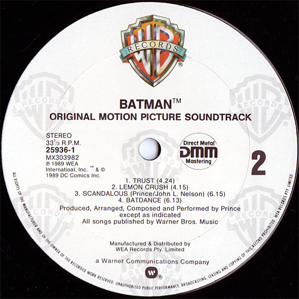 Dust sleeve: All choir, horn and orchestra parts [...] samples of the parts are re-arranged and performed by Prince. Recorded and mixed at Paisley Park Studios [...] 'Electric Chair' mixed [...] at the Grey Room. Mastered at Masterdisk, New York. Sheena Easton appears courtesy of MCA Records, Inc. TM & © 1989 DC Comics Inc. Labels: [DMM Direct Metal Mastering logo]