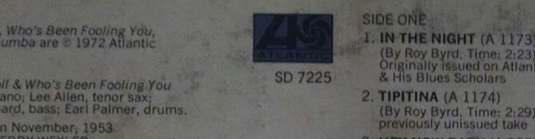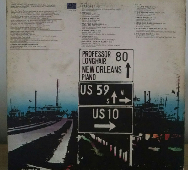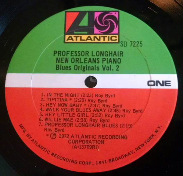 This version pressed at [l408779], as indicated by 'RI' in the labels' matrices. Issued in a gatefold cover, with rough textured print both outside and inside gatefold. A1, A2, B1, B2 recorded in New Orleans, Louisana, in November 1953. A3 to A7, B3 to B6 recorded in New Orleans, Louisana, in 1949. This album was recorded in mono and can be played on any mono or stereo record player. From label: ℗ 1972 Atlantic Recording Corporation (A2, A3, B1 to B4) A1: Originally issued on Atlantic 1020 as Professor Longhair & His Blues Scratchers. A2: Previously unissued take. A3, B1 to B4: Previously unissued. A4, A7: Originally issued on Atlantic 906 as Professor Longhair & His Blues Scholars. A5, A6: Originally issued on Atlantic 947 as Roland Byrd. B5, B6: Originally issued on Atlantic 897 as Roy "Baldhead" Byrd.