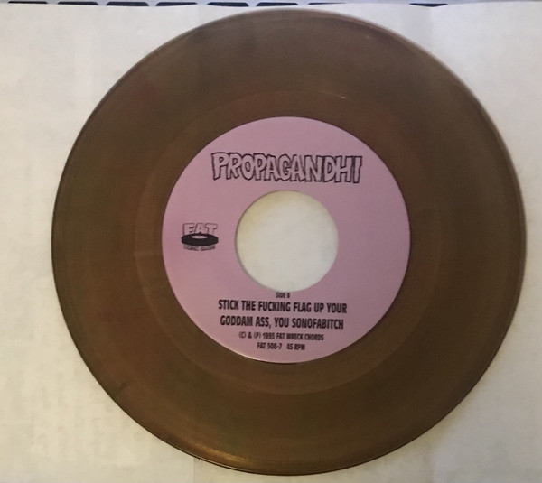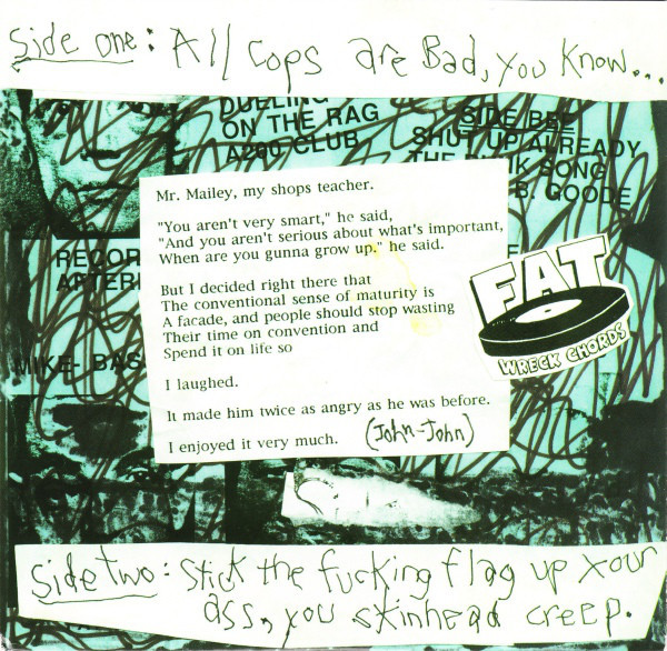 Clear piss colored vinyl pressing with xeroxed insert. Also released on [url=http://www.discogs.com/release/1356983]clear orange vinyl[/url] and black. This has lighter pink labels too, compared to the orange vinyl. Alternate track titles listed on the rear sleeve as: Side A - All Cops Are Bad, You Know... Side B - Stick The Fucking Flag Up Your Ass, You Skinhead Creep. The cover of this record is overlaid on top of the NOFX 7" [r=490287]. Includes an insert. (C) & (P) 1993 FAT WRECK CHORDS