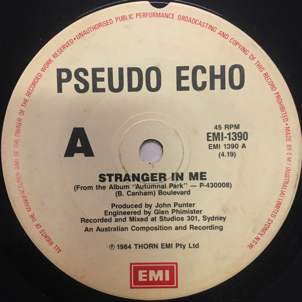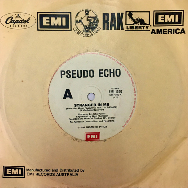 [A] From the Album [url=https://www.discogs.com/master/79686]"Autumnal Park"[/url] - P-430008 [A] Recorded and Mixed at Studios 301, Sydney [B] Recorded at Richmond Recorders, Melbourne An Australian Composition and Recording ℗ 1984 THORN EMI Pty Ltd Generic EMI company sleeve. Also issued in a [url=https://www.discogs.com/release/11462049]picture sleeve.[/url]