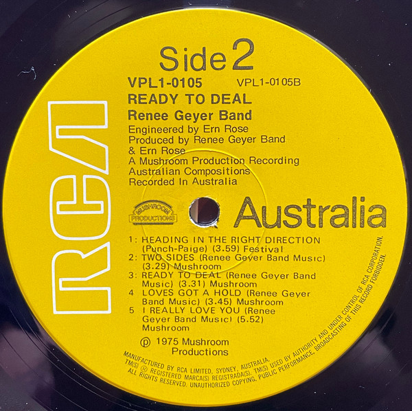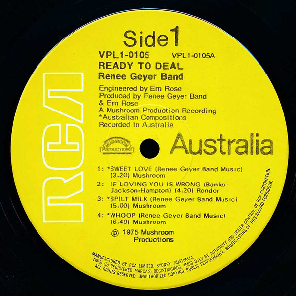 On the back cover for track A2 'If Loving You Is Wrong' is incorrectly attributed for 'Composition' to M. Rice and L. Ingram, although correct on the label. [a386255] made the most successful recording of this song. On the labels the compositions A1, A3, A4, B2 to B5 have 'Renee Geyer Band Music'. [Back cover] Recorded at Armstrongs Studios, Melbourne Australia August - September 1975 Design and Photography Graeme Webber, Returb Studios All compositions Renée Geyer Band © Mushroom Music except 'Heading In The Right DIrection' - Mark Punch and Garry Paige 'If Loving You Is Wrong' - M. Rice and L. Ingram Thanks to George Thanks to the Victorian Police Gaming and Licensing Squad for assistance with props A Mushroom Production Manufactured for/by and distributed by RCA limited, Sydney, Australia and Auckland, New Zealand [Spine] Made in Australia [Labels] A Mushroom Production Recording A1, A3 to B5 <> Australian compositions recorded in Australia ℗ 1975 Mushroom Productions Manufactured by RCA limited, Sydney, Australia [Publishing] A1, A3, A4, B2 to B5 <> Mushroom A2 <> Rondor B1 <> Festival