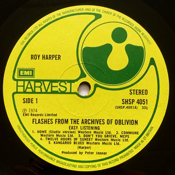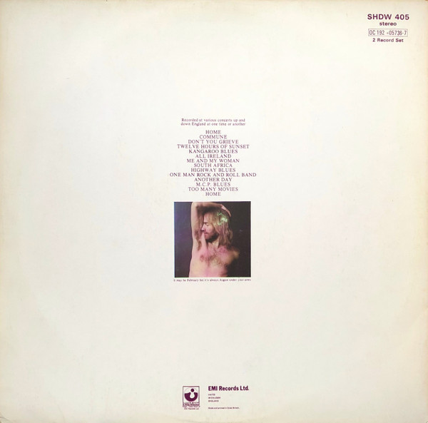 Gatefold Cat# SHDW 405 on back of sleeve and spine. Cat# 0C 192 ∘ 05736-7 on back of sleeve only (in a box). [from inner gatefold] Recorded at various concerts up and down England at one time or another and mixed at EMI Studios, Abbey Road. Sleeve Design, Continuous Argument between Roy Harper and Hipgnosis (AND IT SHOWS) [from back cover] Made and printed in Great Britain. ℗ 1974 EMI Records Limited Matrix on labels are in parentheses Runouts are stamped.