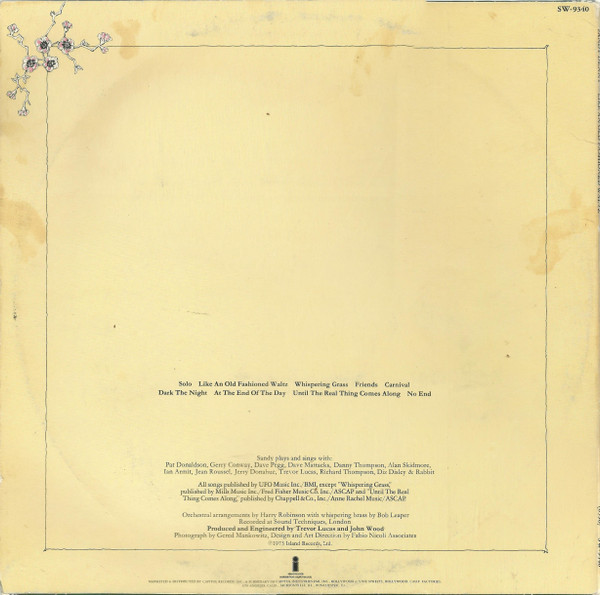 Non-gatefold and non-embossed sleeve. Island Records label with sunrise and clouds (see photos) and pink rim (the ones which show up in the UK before the US). [url=https://www.discogs.com/label/313266-Capitol-Records-Pressing-Plant-Los-Angeles]Los Angeles Pressing[/url] from '✲' in runouts. Similar to [url=https://www.discogs.com/Sandy-Denny-Like-An-Old-Fashioned-Waltz/release/2150032]this Winchester pressing[/url] but with different typography on the labels (in this version 'Sandy Denny' written above 'Like An Old Fashioned Waltz' and both are in a larger font). On back cover: ℗1973 Island Records, Ltd. On labels: ℗ 1974 Island Records, Ltd. Publishing Rights UFO Music Inc. - BMI: A1, A2, A4, A5, B1, B2, B4 Mills Music Inc. - ASCAP: A3 Fred Fisher Music Co. Inc. - ASCAP: A3 Chappe;; & Co., Inc. - ASCAP: B3 Anne Rachel Music - ASCAP: B3