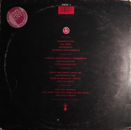 Recorded live at Le Zenith, Paris in Aug 1986 except 'Someone Somewhere In Summertime', recorded live at Sydney Entertainment Centre, Australia. hype sticker "Edição Especial" Gatefold sleeve with a 16 pages booklet inside. SMDL 1 on cover spine