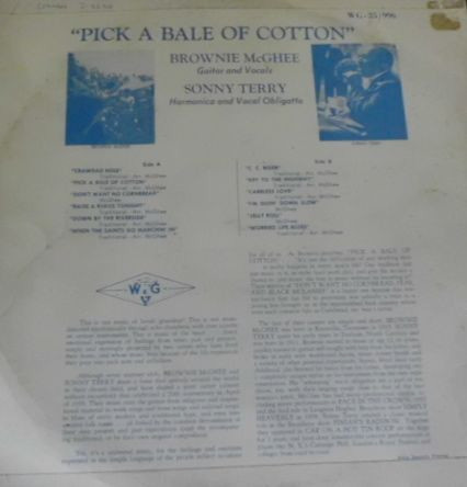 Folk Blues, Spirituals and Works Song by Brownie McGhee and Sonny Terry Track Listing is as per label and as the record plays. The cover has Side A: 1. Crawdad Hole; 2. Pick A Bale Of Cotton; 3. Don't Want No Cornbread; 4. Raise A Ruckus Tonight; 5 Down By The Riverside; 6. When The Saints Go Marchin' In Side B: 1. C.C. Rider; 2. Key To The Highway; 3. Careless Love; 4. I'm Goin' Down Slow; 5. Jelly Roll; 6. Worried Life Blues