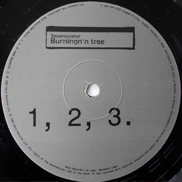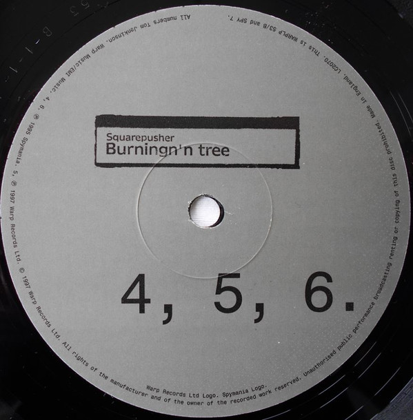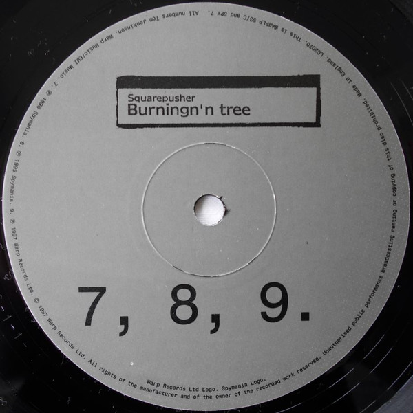 This version has only a single pressing ring on labels just like on the whitelabel release of [r=11832112]. The otherwise very similar [r=30807] has three concentric rings instead. All tracks are untitled on the record itself and are presented in a sequential manner from 1 to 12. Track titles taken from the original recordings [url=http://www.discogs.com/release/191]Conumber E:P[/url] and [url=http://www.discogs.com/release/19713]Alroy Road Tracks[/url], as Duke Of Harringay. The three new tracks have no known titles. [On rear sleeve:] Squarepusher's Spymania recordings plus 3 new tracks @ 33.3 RPM This is WARPLP 53 / SPY 7. 4, 6, 8, 10. ℗ 1995 Spymania. 1, 3, 7, 11, 12. ℗ 1996 Spymania. 2, 5, 9. ℗ 1997 Warp Records Ltd. © 1997 Warp Records Ltd. [On label A rim:] Warp Music/EMI Music. 1, 3. ℗ 1997 Warp Records Ltd. © 1997Warp Records Ltd. Made in England. This is WARPLP 53/A and SPY 7. [On label B rim:] Warp Music/EMI Music. 4, 6. ℗ 1995 Spymania 5, ℗ 1997 Warp Records Ltd. © 1997 Warp Records Ltd. Made in England. This is WARPLP 53/B and SPY 7. [On label C rim:] Warp Music/EMI Music. 7. ℗ 1997 Spymania. 8. ℗ 1998 Spymania. 9. ℗ 1997 Warp Records Ltd. © Warp Records Ltd. Made in England. This is WARPLP 53/C and SPY 7. [On label D rim:] Warp Music/EMI Music. 10, ℗ 1995 Spymania. 11, 12. ℗ 1996 Spymania. ℗ 1997 Warp Records Ltd. © Warp Records Ltd. Made in England. This is WARPLP 53/D and SPY 7. Durations not mentioned on release.